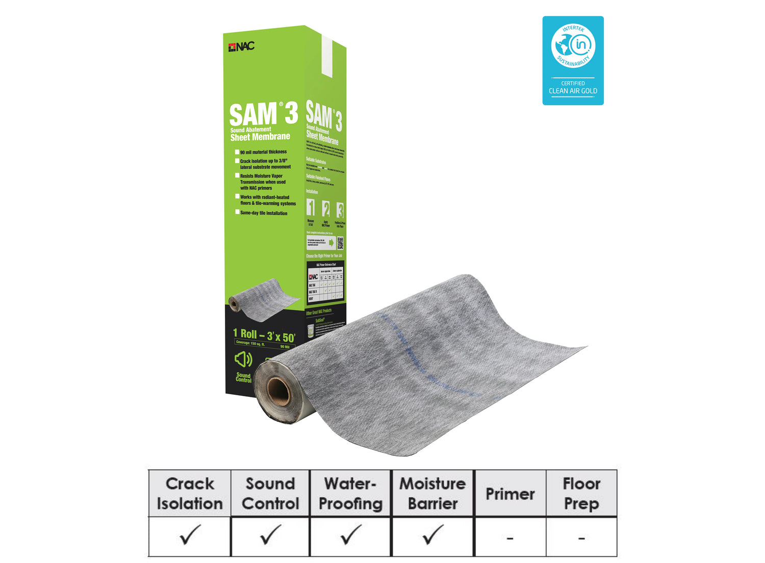 SAM 3 is a low profile membrane which functions as a moisture barrier and provides crack isolation up to 3/8”. SAM 3 also protects against reflective cracking and will function as a waterproof membrane when the seams and joints are properly treated.