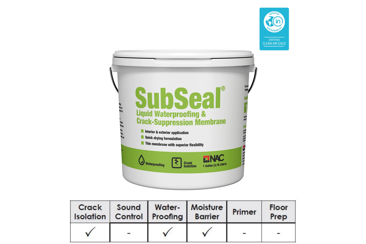 Subseal liquid membrane is an elastomeric waterproofing membrane for interior and exterior applications of hard surface flooring. This one-part, ready-to-use membrane covers all bases as a sealant, stand-alone crack suppressant and moisture barrier for horizontal and vertical applications.