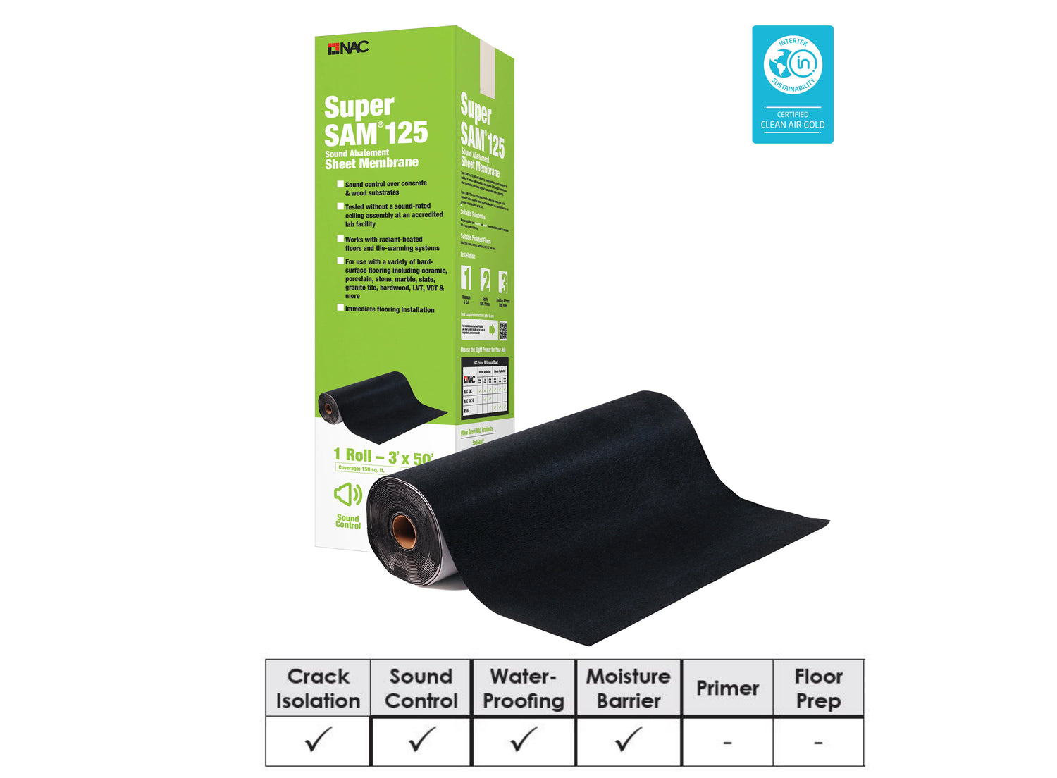 Super SAM 125 is known as one of the most effective all-in-one membranes on the market due to its superior sound reduction as well as its ability to also function as a moisture barrier and provide crack isolation up to 3/8”. Super SAM 125 can also function as a waterproof membrane when the seams and joints are properly treated.